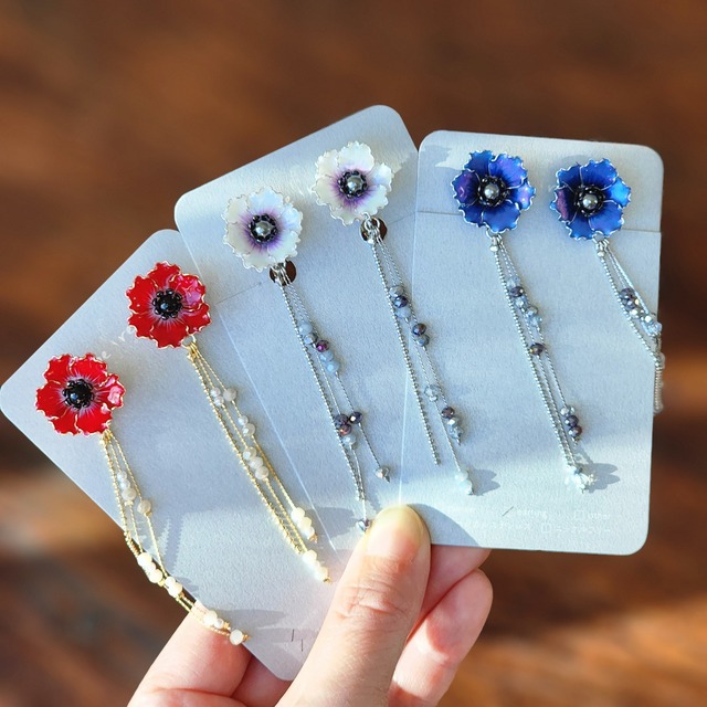 【 アネモネ 】 ※赤のみの販売です 深みのある赤が印象的な、アネモネモチーフのアクセサリー。 花びらの縁には繊細なニュアンスを施し、 中心には艶のあるブラックパーツを合わせることで、 甘さの中に凛とした強さを感じるデザインに仕上げました。 花の下で揺れるチェーンとビーズは、 動くたびに縦のラインを強調し、 横顔をすっきりと美しく見せてくれます。 シンプルな装いのアクセントにはもちろん、 特別な日のコーディネートにも映える一輪です。 お花部分の直径約2cm ピアスは2way仕様となり、 お花だけの一輪ピアスとしても使えます。 イヤリングのチャームは取り外し不可です。 【商品詳細】 •ピアス(サージカルステンレス)には チャーム付きキャッチの他に 下向き防止キャッチ(シリコン)×1ペアが付きます。 •イヤリング(メッキ)にはシリコンカバーが付いています。 •重さは片耳分で3gほどです。 •全長 ピアス/約8cm イヤリング/約8cm •着用画像はイヤリングです。 ピアスの場合デザインにより見え方が変わりますのでご注意ください。 •商品納期 手元に在庫がある場合は即日、または翌日発送。 受注生産の場合は1~2週間いただきます。 ⚠ご購入の前に必ず 【商品ご購入の前に】のページをお読みください。