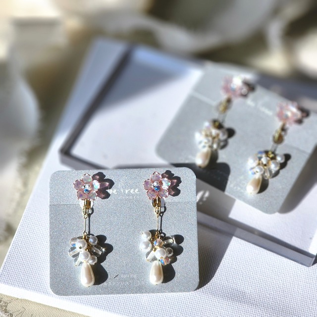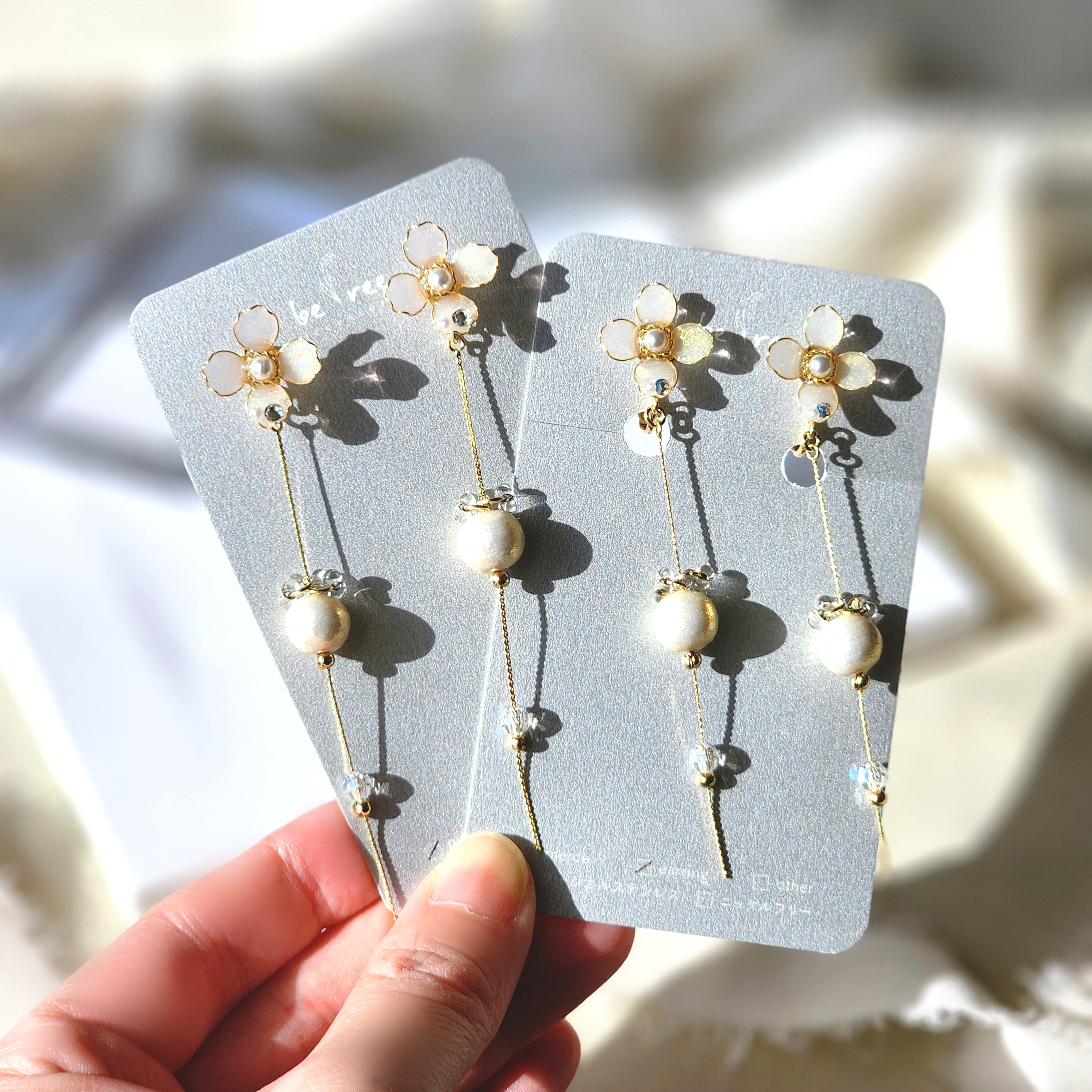 - hidamari - やわらかな光をまとった ふんわり優しいアクセサリー。 耳元で静かに揺れるのは コットンパールとクリスタルの繊細なチェーン。 歩くたび、呼吸するたび、 余韻のようにやさしく揺れ動きます。 甘くなりすぎないオフホワイトと ゴールドの組み合わせは 日常使いはもちろん 少し特別な日にも寄り添うデザイン。 控えめなのに、ふと目を惹く。 そんな大人のためのお花アクセサリーです。 ピアスは2way仕様となり、 お花だけの一輪ピアスとしても使えます。 イヤリングのチャームは取り外し不可です。 お花の直径は約2cmです* 【商品詳細】 •ピアス(サージカルステンレス)には チャーム付きキャッチの他に 通常のキャッチ×1ペアが付きます。 •イヤリング(メッキ)にはシリコンカバーが付いています。 •重さは片耳分で1~2gほどです。 •全長 ピアス/約8.5cm イヤリング/約8cm •着用画像は色違いのイヤリングです。 ピアスの場合デザインにより見え方が変わりますのでご注意ください。 •商品納期 手元に在庫がある場合は即日、または翌日発送。 受注生産の場合は1~2週間いただきます。 ⚠ご購入の前に必ず 【商品ご購入の前に】のページをお読みください。