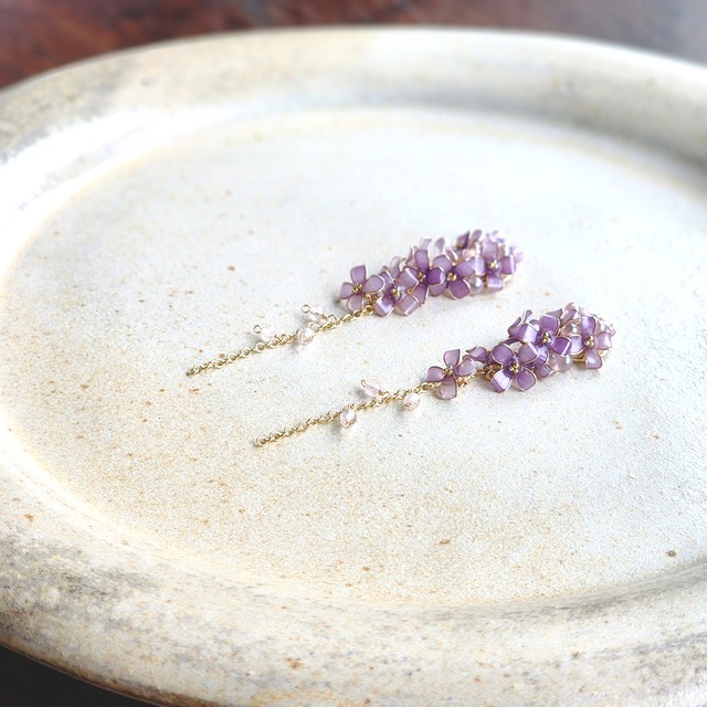 【 恋するライラック 】 ※天然石のサイズが1㎜大きくなりました パープルのライラックの花言葉は 『初恋』『恋の芽生え』 生まれたばかりの初々しい小さな恋心を 淡くて優しいパープルで表現してみました。 どこか儚げな印象を与えてくれるアクセサリー。 主張しすぎないほんのりミルキーなパープルは ほんの少しパールを含んでいて 大人女子にぴったりな上品さ。 色味にとことんこだわりました。 片耳9輪両耳18輪、贅沢にお花をあしらい でも程よいボリューム感で絶妙なバランスです。 チェーン部分には極小の天然石*を合わせました。 *モルガナイト 動く度にユラユラ揺れ動く小花が とてもかわいいです♡ うぶなあの頃を思い出しちゃうような、、 そっと寄り添いあなたの恋を応援してくれるような、、 特別な1日をもっと特別にしてくれるような、、 そんなアクセサリーになってくれたら嬉しいです♪ 【商品詳細】 ◎ピアス/サージカルステンレス ◎イヤリング(ネジバネ式)/ニッケルフリー •全長は約7.5~8cm •重さは片耳分で2~3gほどです。 •着用画像は全てイヤリングです。 ピアスの場合、デザインによって見え方が異なる場合もございますのでご注意ください。 •商品納期 手元に在庫がある場合は即日、または翌日発送。 受注生産の場合は1~2週間いただきます。 ⚠ご購入の前に必ず 【商品ご購入の前に】のページをお読みください。